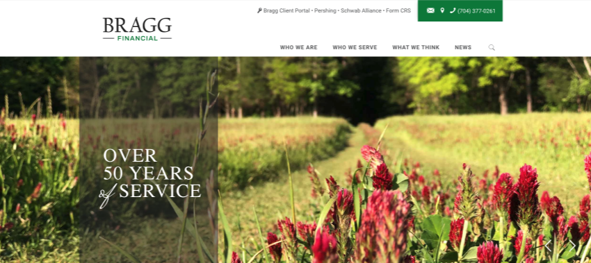 Bragg Financial recognizes the importance of building trust and nurturing client relationships. As you navigate through the site, you’re met with messaging that helps build the image Bragg wants to embody: service-minded, reputable and knowledgeable.