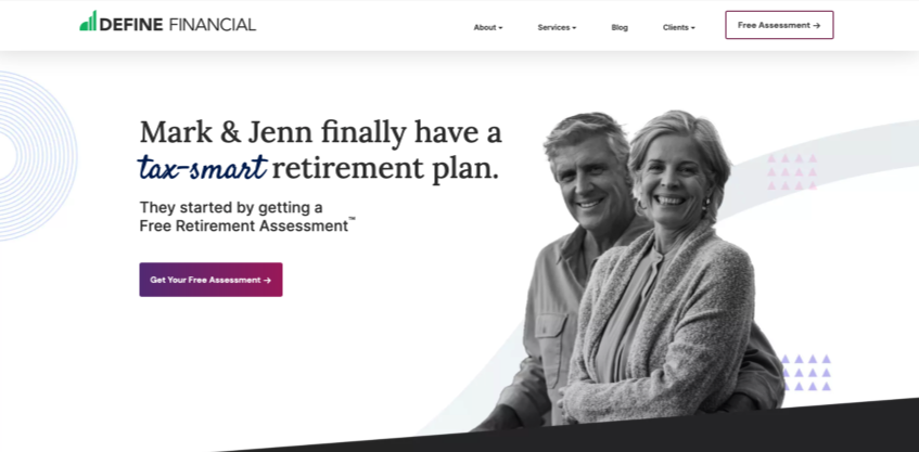 Credibility, also a vital consideration in the financial industry, is also made clear. Define Financial’s choice to highlight its awards and recognitions is a great tactic to appeal to potential new clients.